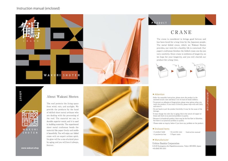 This copper origami folded crane, which we carefully handmade here in Japan, shelters our wish for you and your close family to live a long and healthy life. It will age gracefully, taking such a particular, beautiful glow with time. We hope that you will lovingly keep this one-of-a-kind piece of art forever and pass it on to future generations.